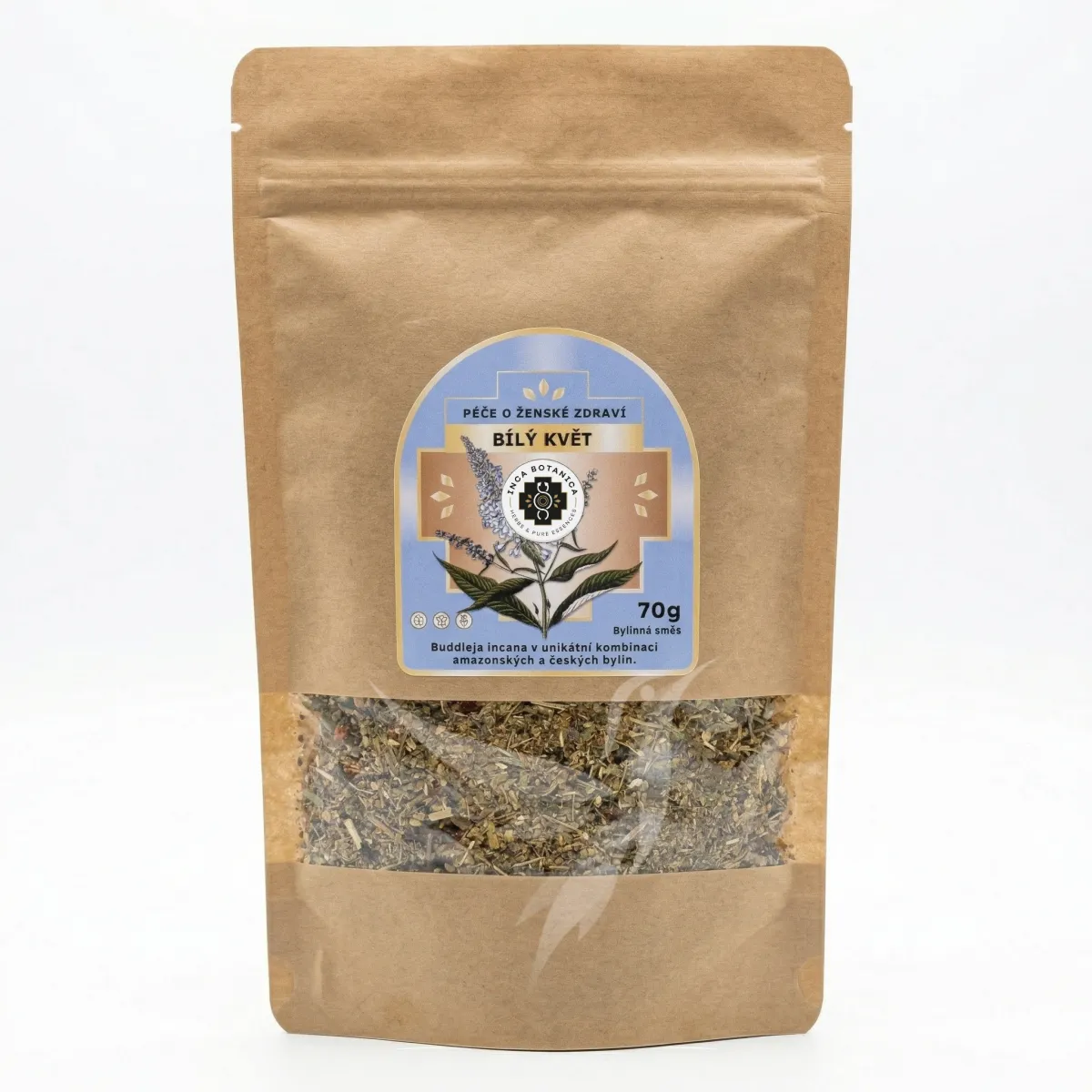 Bylinná čajová zmes Biely kvet spája amazonské rastliny (Flor Blanca, Pasuchaca, Canchalagua) s tradičnými európskymi bylinami (alchemilka, rebríček, praslička). Zmes je pripravená podľa osvedčených receptúr a predstavuje harmonické prepojenie bylín z Ánd a Európy.