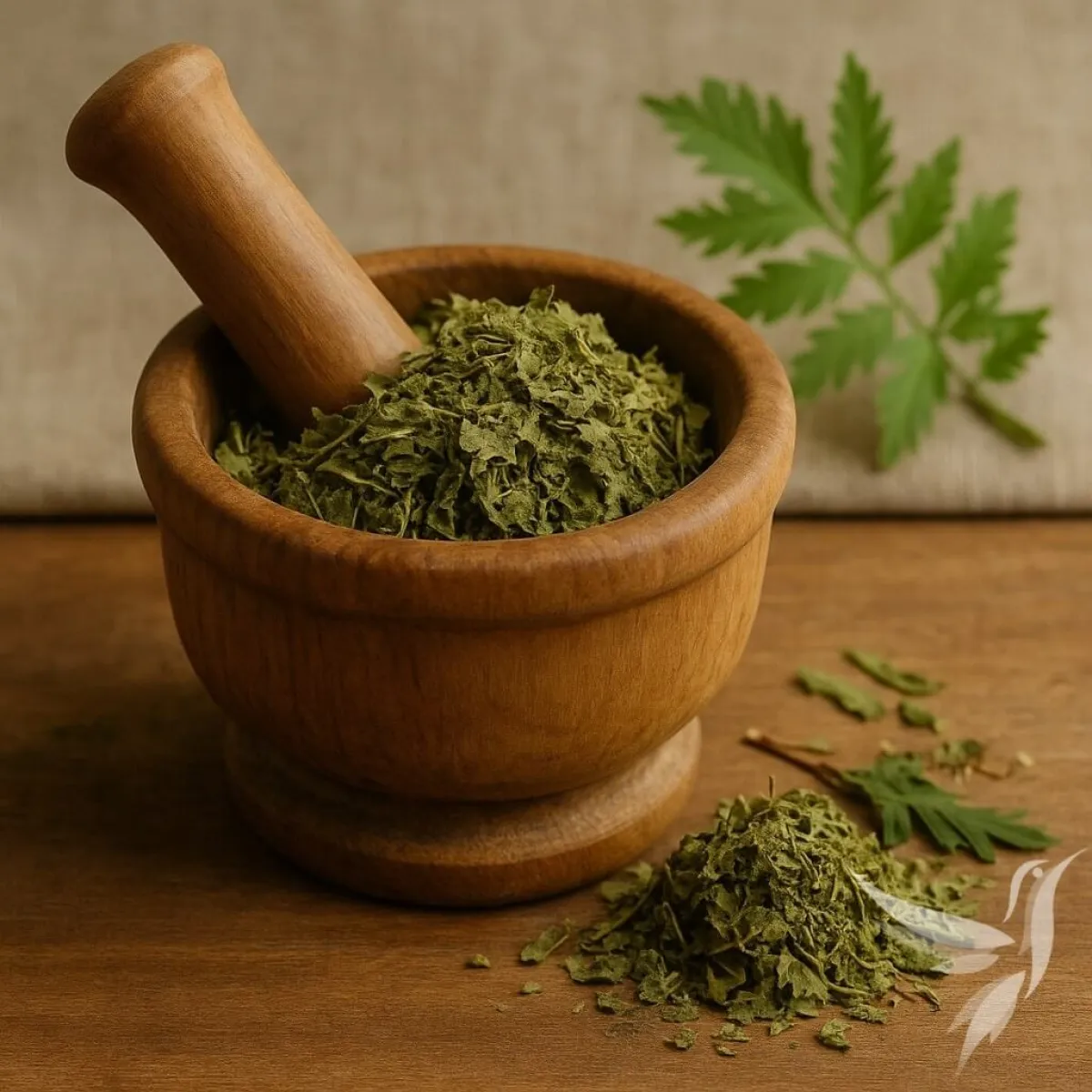 Tradičné použitie: na bolesť hlavy. Preklinický dôkaz: preukázaná analgetická aktivita (model „acetic-acid writhing“ u myší – periférny typ analgézie). Toxikologické hodnotenie: pri orálnej dávke až do 5 g/kg neboli pozorované príznaky toxicity; sledovali sa aj možné účinky na nervový systém – bez nálezu. Chemické zloženie: obsahuje seskviterpénové laktony (ambrosin, allodamsin a i.). Záver: nepriamy súvis s nervovým systémom (nocicepcia, bolesť).
