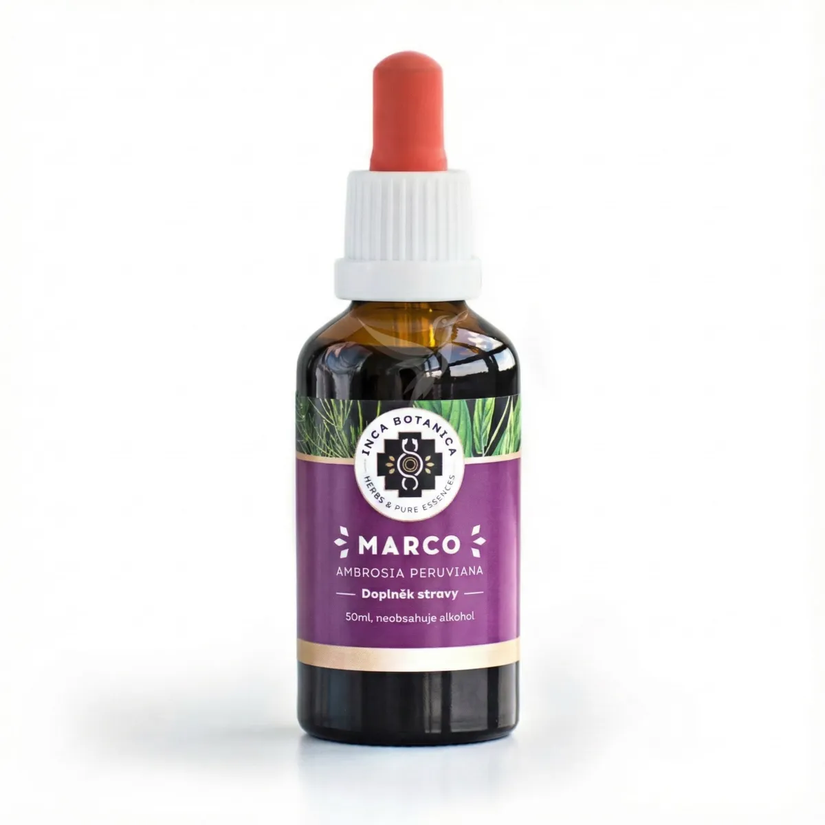 Tradičné použitie: Marco (Ambrosia peruviana) je andská bylina s výraznou arómou a horkastou chuťou, ktorú obyvatelia Peru a Bolívie odpradávna používajú ako rastlinu očisty a svetla. V tradičnej medicíne sa pripravovali odvary na podporu tráviaceho a dýchacieho systému a listy sa spaľovali pri rituáloch na očistenie priestoru od negatívnej energie. Marco bolo považované za „rastlinu slnka“, ktorá prináša jas a rovnováhu do tela aj mysle.
