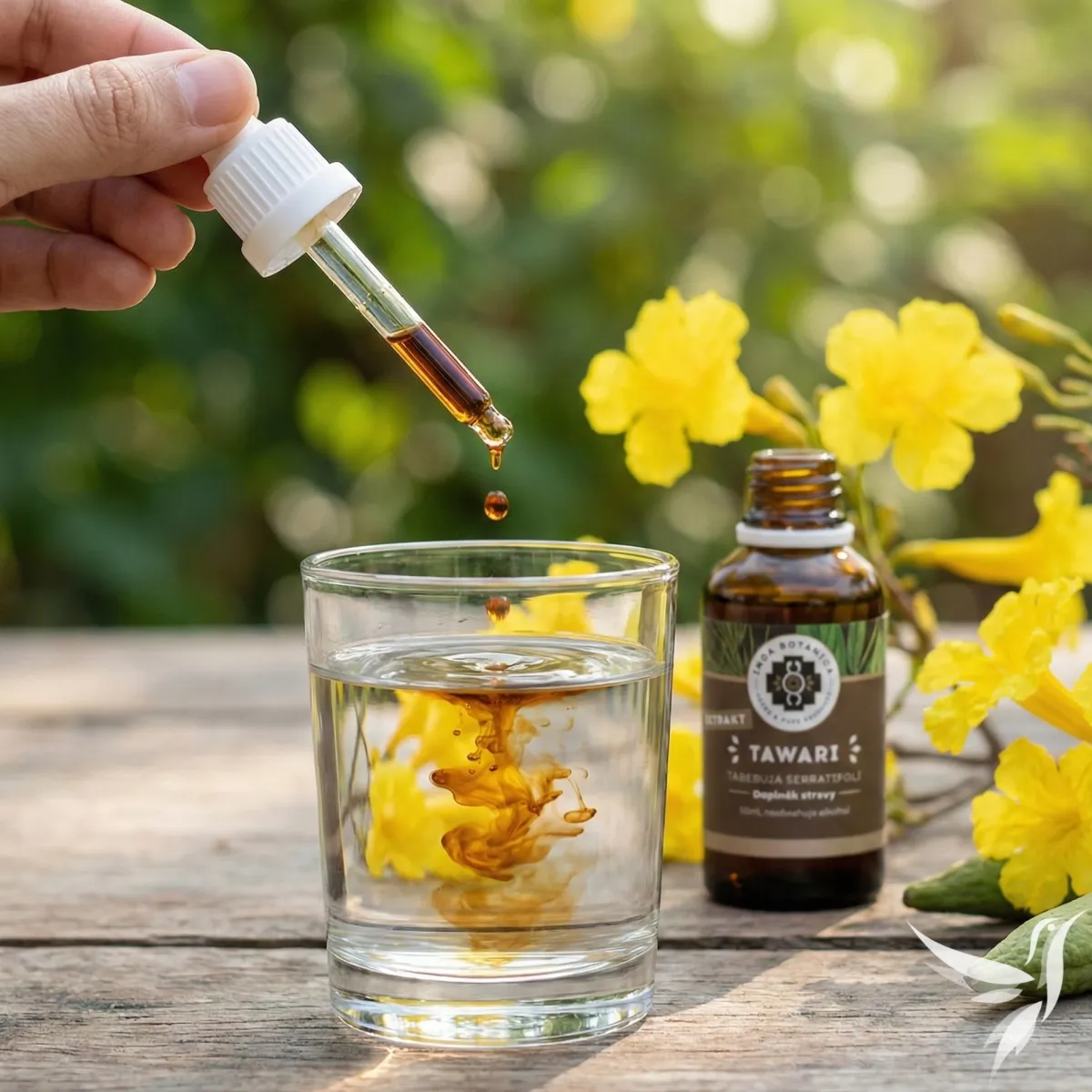 Zaujímavý fakt a ekológia: Strom Tawari dorastá až do výšky 30 metrov a kvitne práve v období sucha, keď väčšina vegetácie spí. Jeho zlatožlté kvety sa stali symbolom vitality pralesa. Zber kôry pre výrobu extraktov prebieha šetrne – využívajú sa len časti, ktoré umožňujú regeneráciu stromu, aby zostal ekosystém Amazónie zachovaný pre ďalšie generácie.