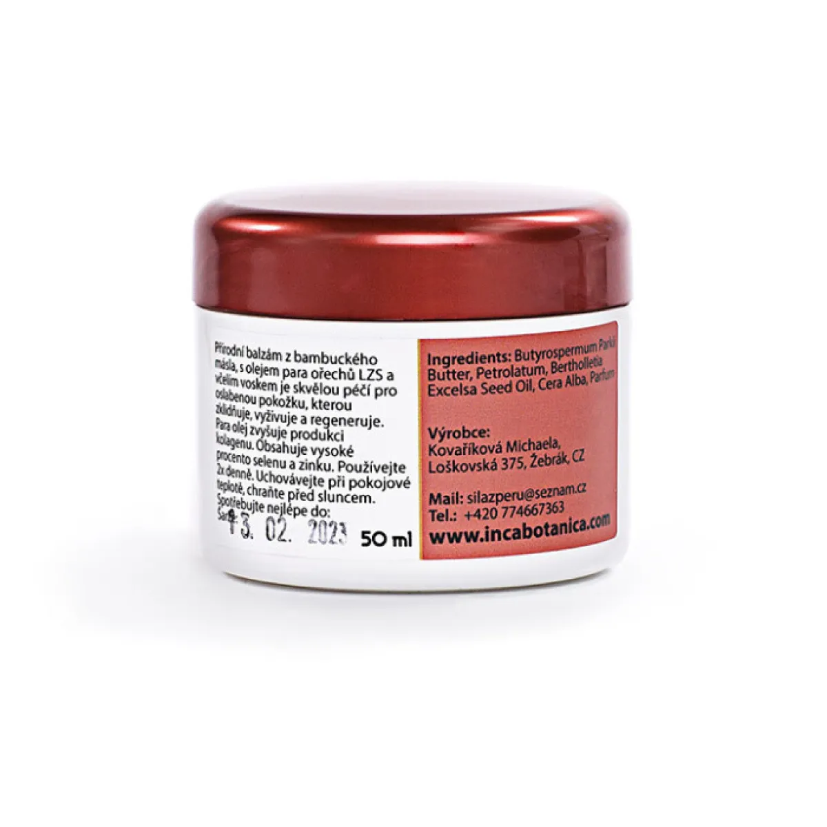 Prírodný balzam z bambuckého masla s BIO para olejom lisovaným za studena a včelým voskom (surový, nebielený) má pre pokožku blahodarné a upokojujúce účinky, zmierňuje podráždenie či začervenanie citlivej pleti. Uľavuje od nepríjemného pnutia.